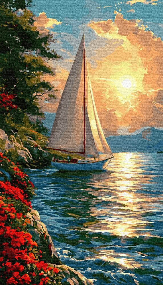 Set pictura pe numere cu sasiu inclus,  Golful viselor luminoase, 40x70 cm. Pachetul contine: panza din bumbac intinsa pe sasiu din lemn, setul de culori acrilice numerotate, pensule de diferite marimi si accesorii pentru a crea un tablou spectaculos. Da start creativitatii!