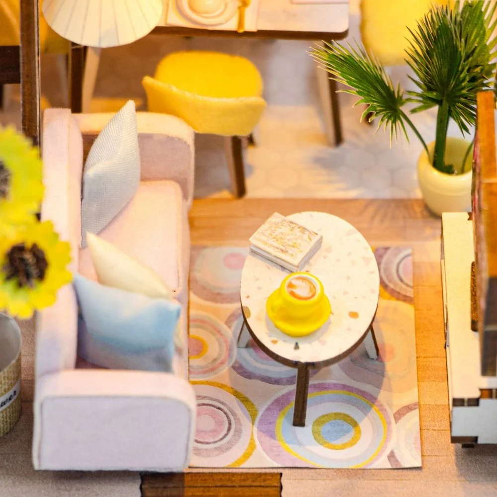Penthouse este un sanctuar in miniatura al vietii moderne - sic, confortabil si plin de caldura. Proiectat in tonuri pastelate moi si iluminat de o lumina blanda, acesta transforma biblioteca antr-un apartament tip loft elegant, plin de farmec. In interior, fiecare detaliu spune o poveste despre casa: o canapea roz plusata cu perne decorative, o masa insorita pentru doua persoane, o bucatarie moderna dotată cu articole esentiale si un dormitor luminos tip loft la etaj. Floarea-soarelui si plantele de apartament aduc atingeri proaspete ale naturii, in timp ce pandantivele aurii si candelabrele delicate adauga eleganta spatiului.