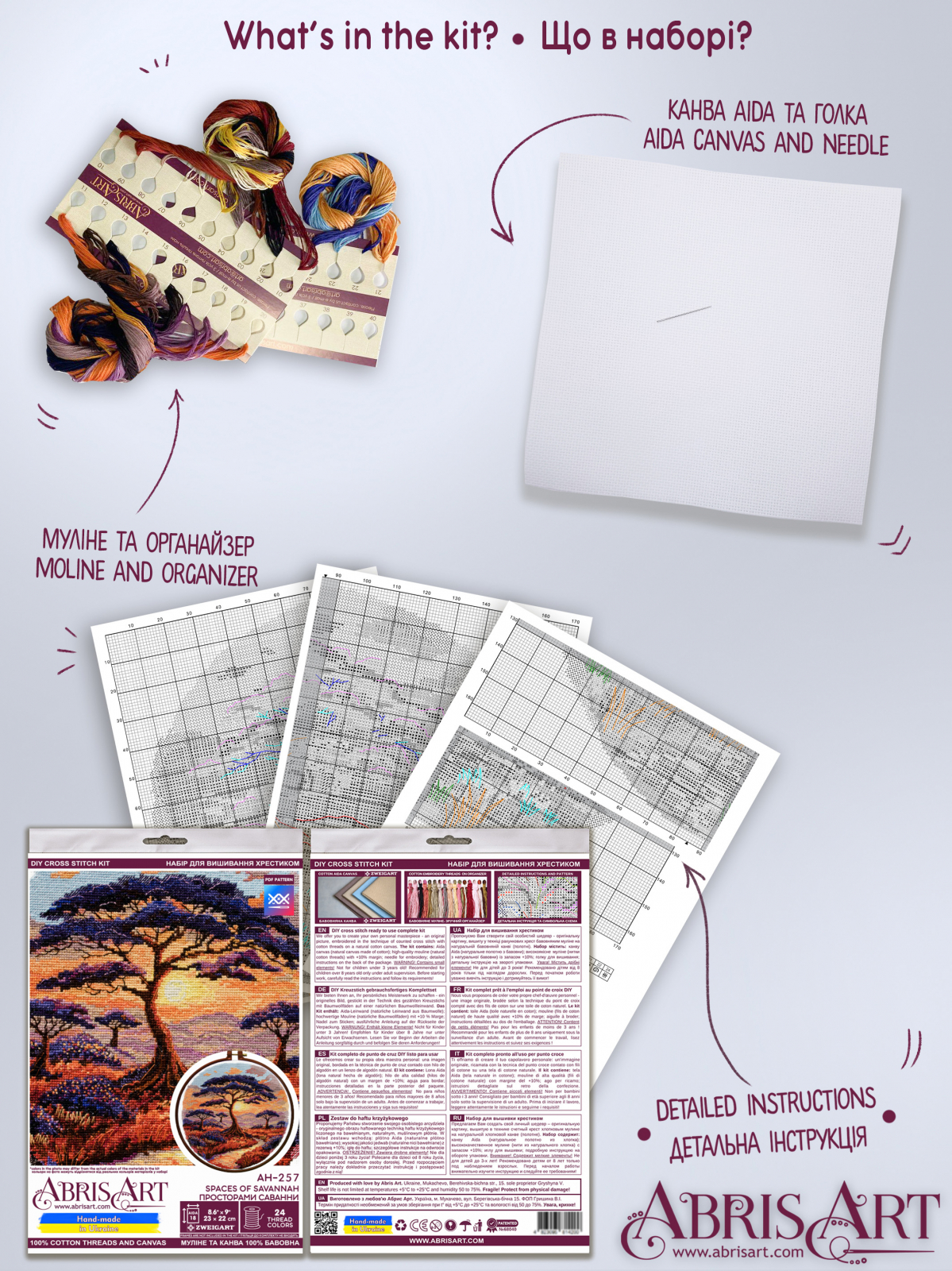 Setul de broderie in cruciulita Savana contine: panza, 24 de seturi de ate colorate, ace, diagrama, instructiuni. Da start creativitatii!
