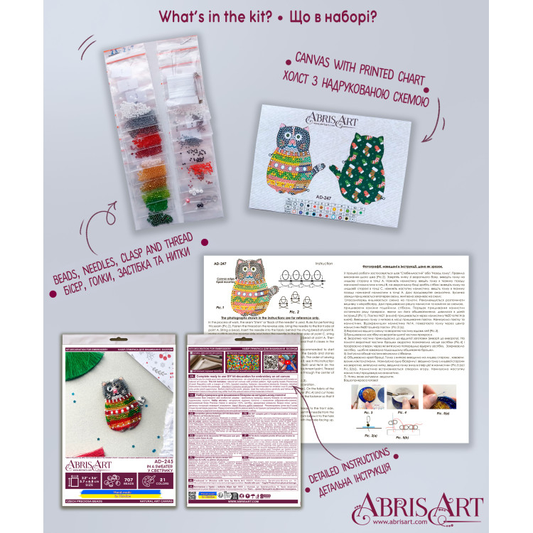 Set decorativ (brosa) Pisica cu plover.Setul contine: panza naturala, din bumbac, 21 culori, 709 margele, ace pentru broderia cu margele, sistem de prindere, fetru, elemente decorative, instructiuni. Da start creativitatii!