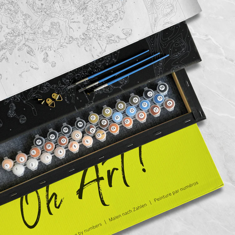 Despre panza Poti incepe sa pictezi din prima secunda. Spre deosebire de alte seturi picturi pe numere, acest set vine cu o panza deja intinsa pe o rama din lemn. Panza este din bumbac si are imprimate numerele culorilor pe care le vei folosi.