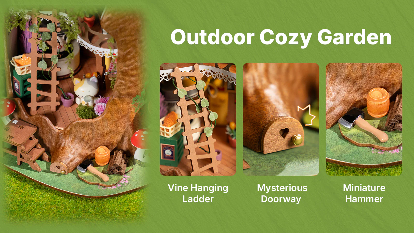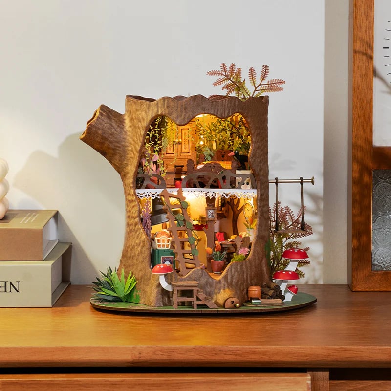 Adanc in padure se afla o mica casuta, ascunsa in interiorul unui trunchi gol de copac. Aici traiesc mici creaturi ale padurii, folosind obiectele pierdute sau aruncate ale oamenilor ca obiecte de mobilier si accesorii. Un ceas fara curea devine un ceas de perete, o pereche de zaruri servesc drept masute, iar o palnie se transforma intr-o hota. Datorita ingeniozitatii locuitorilor padurii, aceasta casa simpla cu doua etaje are de toate: mobilier din lemn, un dormitor confortabil, o bucatarie, o zona de luat masa, electrocasnice, decoratiuni murale, plante in ghiveci, o gradina de ciuperci si chiar un leagan. Ce ti-ai putea dori mai mult cand natura iti este vecina, iar dragalasenia, companionul? Vino, construieste si spune povestea acestei resedinte confortabile in padure, apoi aprinde luminile LED pentru a transforma proiectul tau intr-un spectacol incantator.
