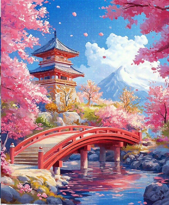 Set goblen cu diamante, cu sasiu, Pod rosu si ciresi infloriti, 40x50 cm