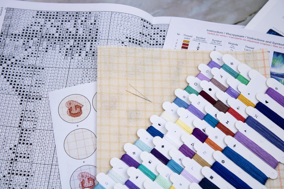 Set goblen de cusut, Aurora Boreala. Setul contine panza caroiata 100 puncte/10 cm, 59 de seturi de ate colorate, ace, schema de realizare (diagrama) si instructiuni. Da start creativitatii!