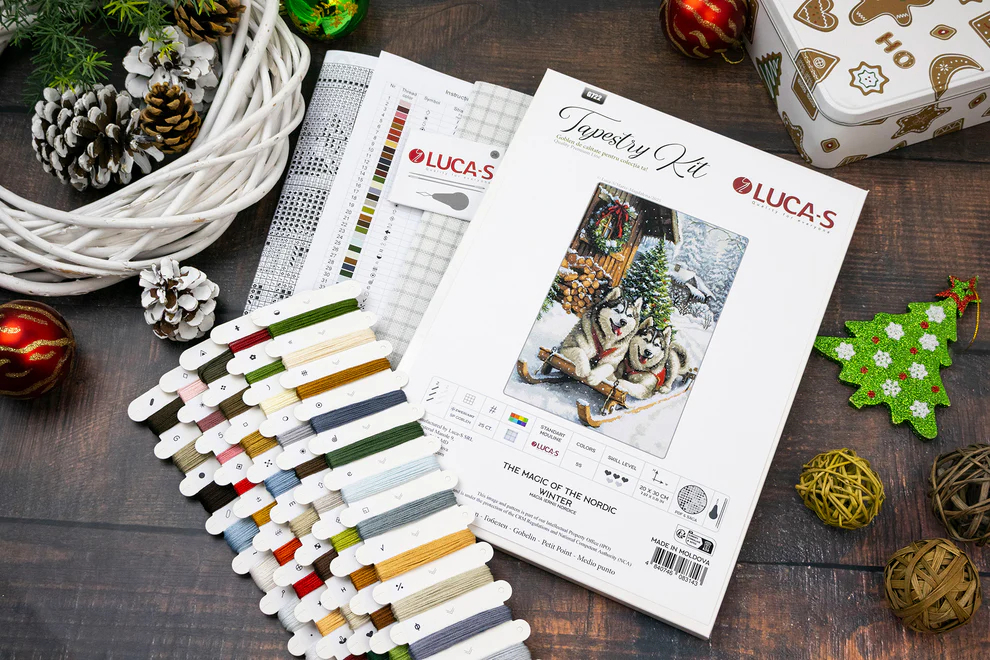 Set goblen de cusut, Magia Iernii Nordice. Setul contine panza caroiata 100 puncte/10 cm, 55 de seturi de ate colorate, ace, schema de realizare (diagrama) si instructiuni. Da start creativitatii!
