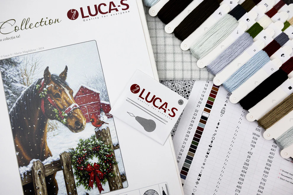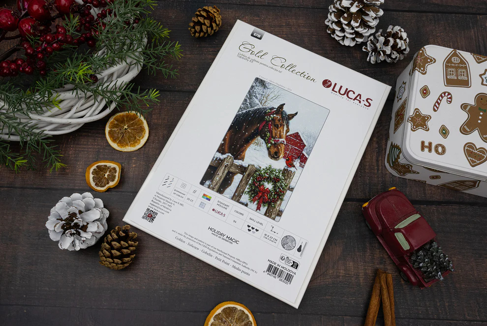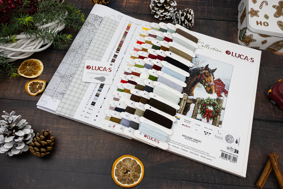 Set goblen de cusut, Magie de Sarbatori. Setul contine panza caroiata 100 puncte/10 cm, 54 de seturi de ate colorate, ace, schema de realizare (diagrama) si instructiuni. Da start creativitatii!