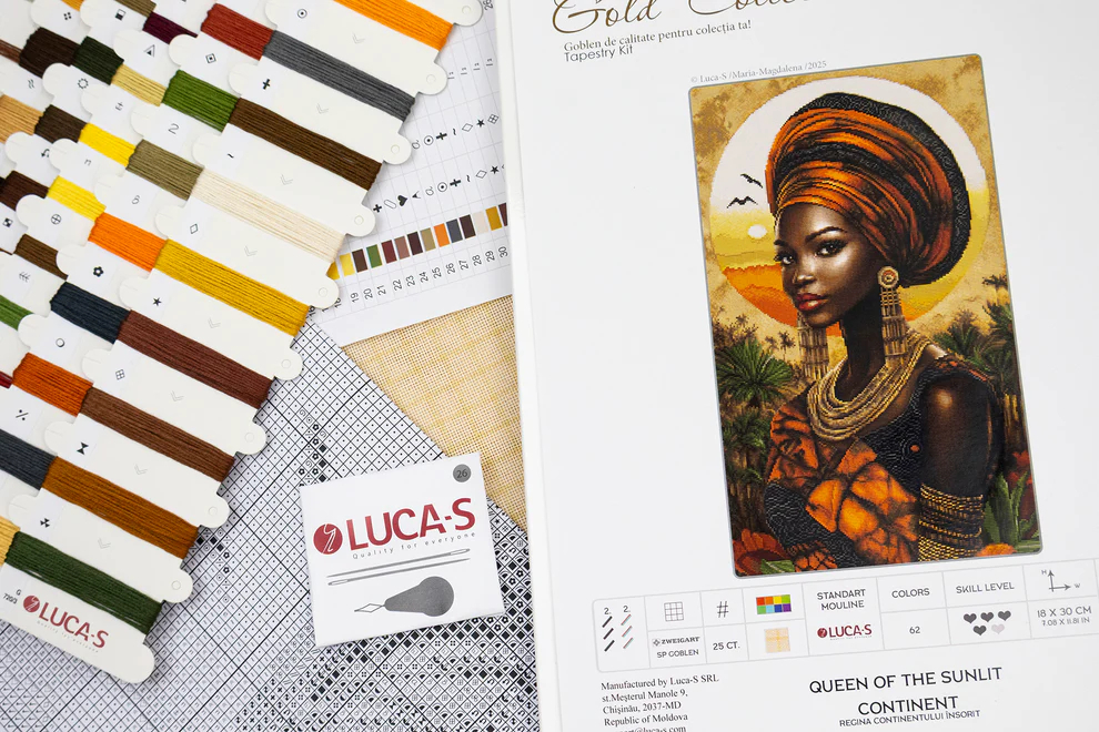 Set goblen de cusut, Regina Continentului Insorit. Setul contine panza caroiata 100 puncte/10 cm, 62 de seturi de ate colorate, ace, schema de realizare (diagrama) si instructiuni. Da start creativitatii!
