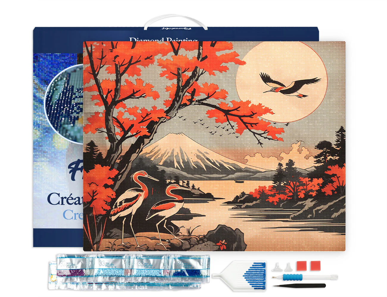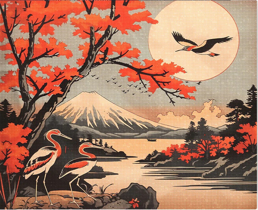 Set goblen cu diamante cu sasiu inclus, Cocori si muntele Fuji, 40x50 cm. Pachetul contine: panza de lucru cu imagine tiparita si suprafata adeziva, margele tip diamante patrate sortate dupa culori cu simboluri ce corespund cu locul lor pe imagine, o tavita pentru diamante, un recipient cu ceara speciala, un stilou special pentru prinderea si plasarea diamantelor cu 2 capete suplimentare si un ghid ilustrat de instructiuni. Da start creativitatii!