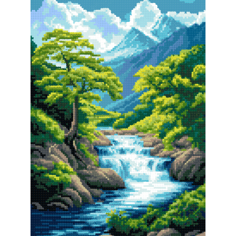 Set goblen cu diamante cu sasiu inclus, Cascada, 30x40 cm. Pachetul contine: panza de lucru cu imagine tiparita si suprafata adeziva, margele tip diamante rotunde, sortate dupa culori cu simboluri ce corespund cu locul lor pe imagine, o tavita pentru diamante, un recipient cu ceara speciala, un stilou special pentru prinderea si plasarea diamantelor si un ghid ilustrat de instructiuni. Da start creativitatii!
