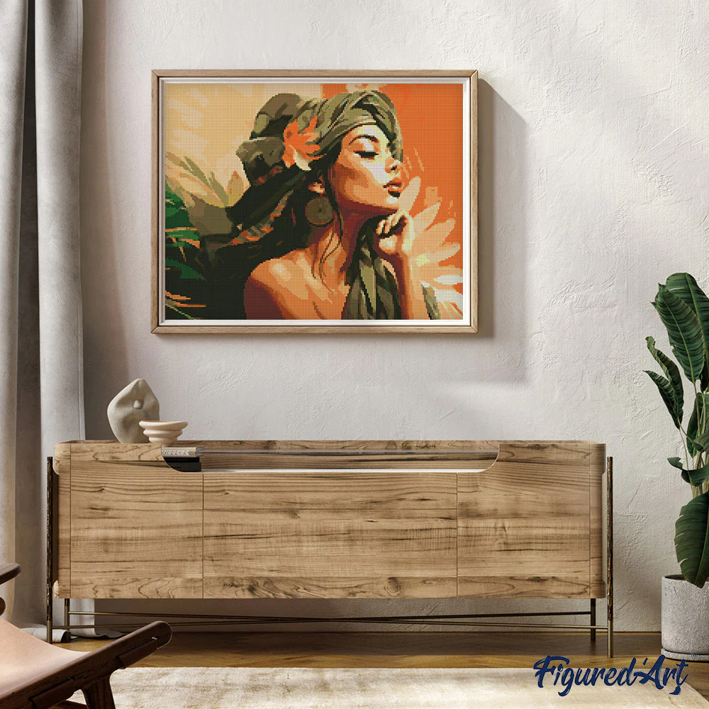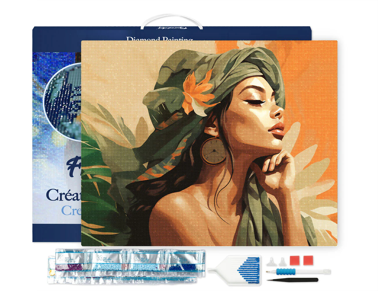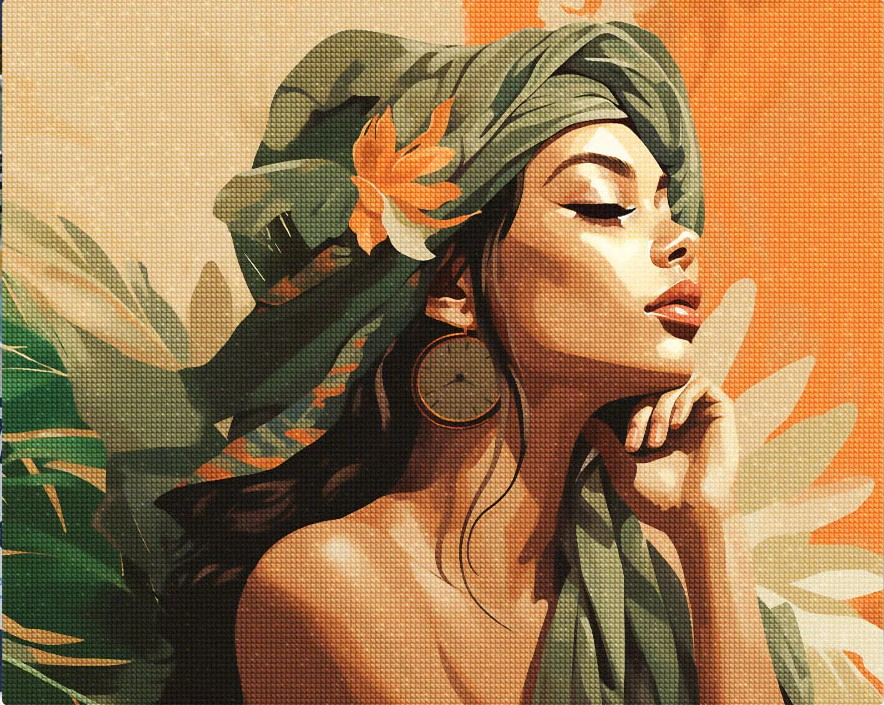 Set goblen cu diamante, cu sasiu, Femeie cu turban verde, 40x50 cm