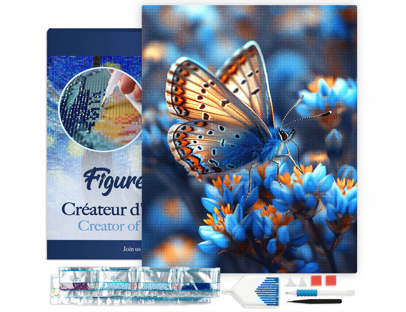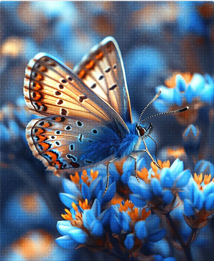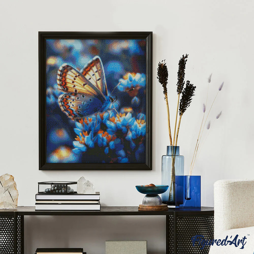 Set goblen cu diamante, cu sasiu, Fluture si flori albastre, 40x50 cm