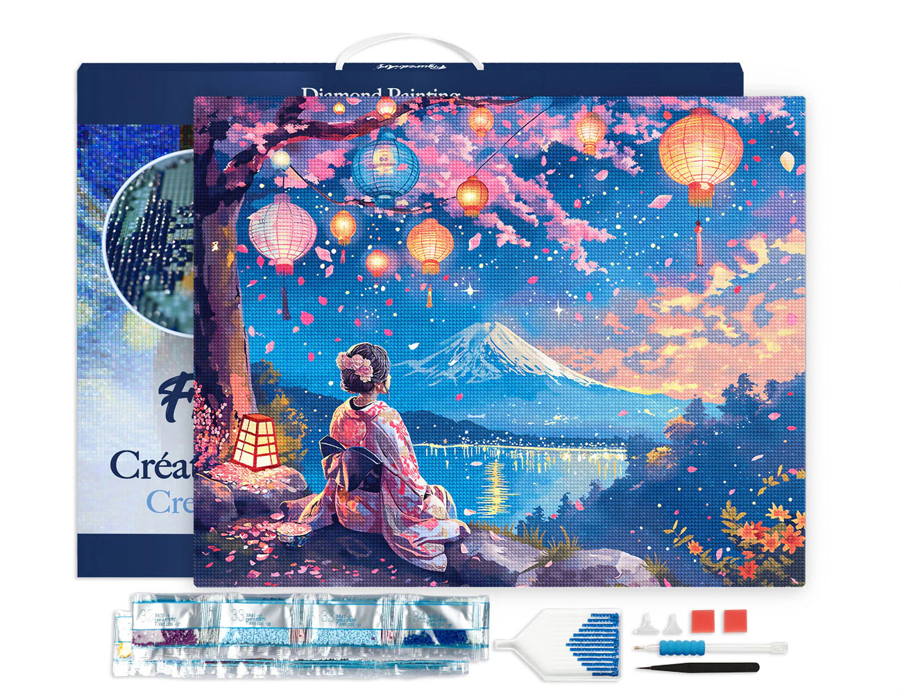 Set goblen cu diamante, cu sasiu, Gheisa, lanterne si muntele Fuji, 40x50 cm