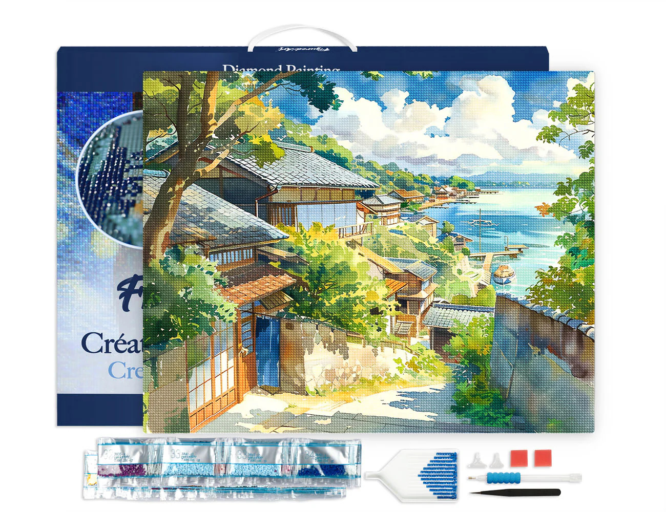 Set goblen cu diamante, cu sasiu, Oras de coasta in Japonia, 40x50 cm