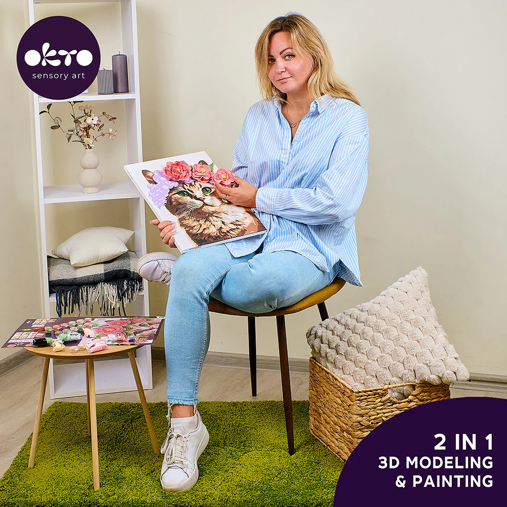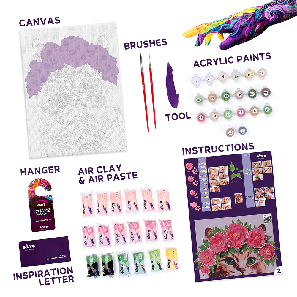 Transforma o pisica eleganta in personajul principal al decorului tau cu setul creativ 2-in-1 Pisica cu coronita. Picteaza pisica si impodobeste-i capul modeland cu argila usoara florile din coronita. La final, obtii un tablou 3D adorabil, perfect pentru camera copiilor, living sau ca dar pentru iubitorii de pisici si arta handmade.O activitate relaxanta pentru adolescensi si adulti.