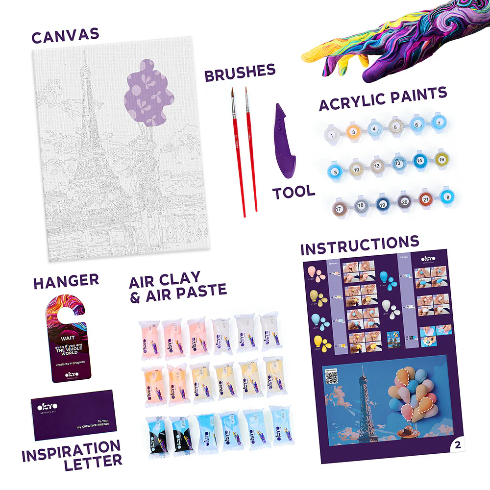 Hai sa vezi Turnul Eiffel din confortul casei tale cu setul creativ 2-in-1 Salutari din Paris. Picteaza atmosfera celui mai romantic oras si lasa-ti visele sa zboare modeland, cu ajutorul argilei usoare, baloanele. La final vei obtine un tablou 3D inspirat de stradutele pariziene, perfect pentru decorul casei sau ca dar creativ pentru iubitorii de arta si calatorii. O activitate relaxanta pentru adolescensi si adulti.