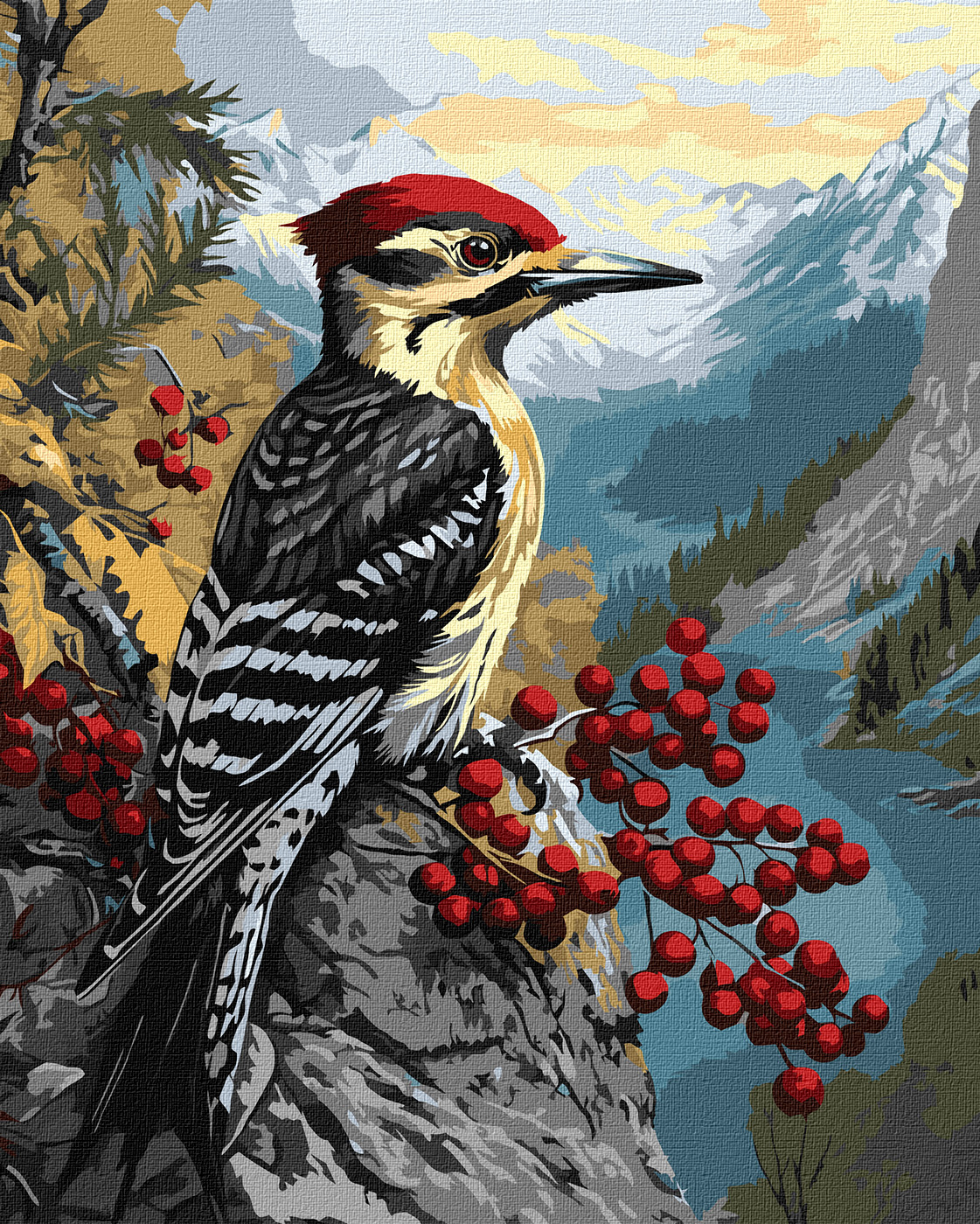 Set pictura pe numere cu sasiu inclus, Ciocanitoare pe ramura de calin, 40x50 cm. Pachetul contine: panza din bumbac intinsa pe sasiu din lemn, setul de culori acrilice numerotate, pensule de diferite marimi, diagrama printata si/sau QR code.Da start creativitatii!