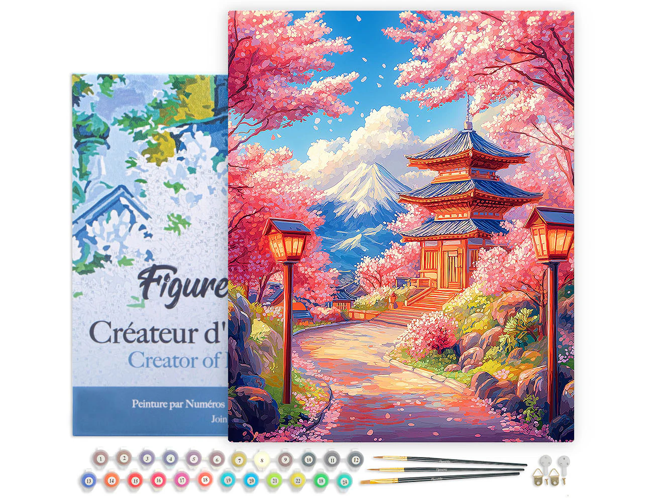 Set pictura pe numere cu sasiu inclus, Drum de sakura spre pagoda, 40x50 cm. Pachetul contine: panza din in intinsa pe sasiu din lemn, setul de culori acrilice numerotate, pensule de diferite marimi si accesorii pentru a crea un tablou spectaculos. Da start creativitatii!