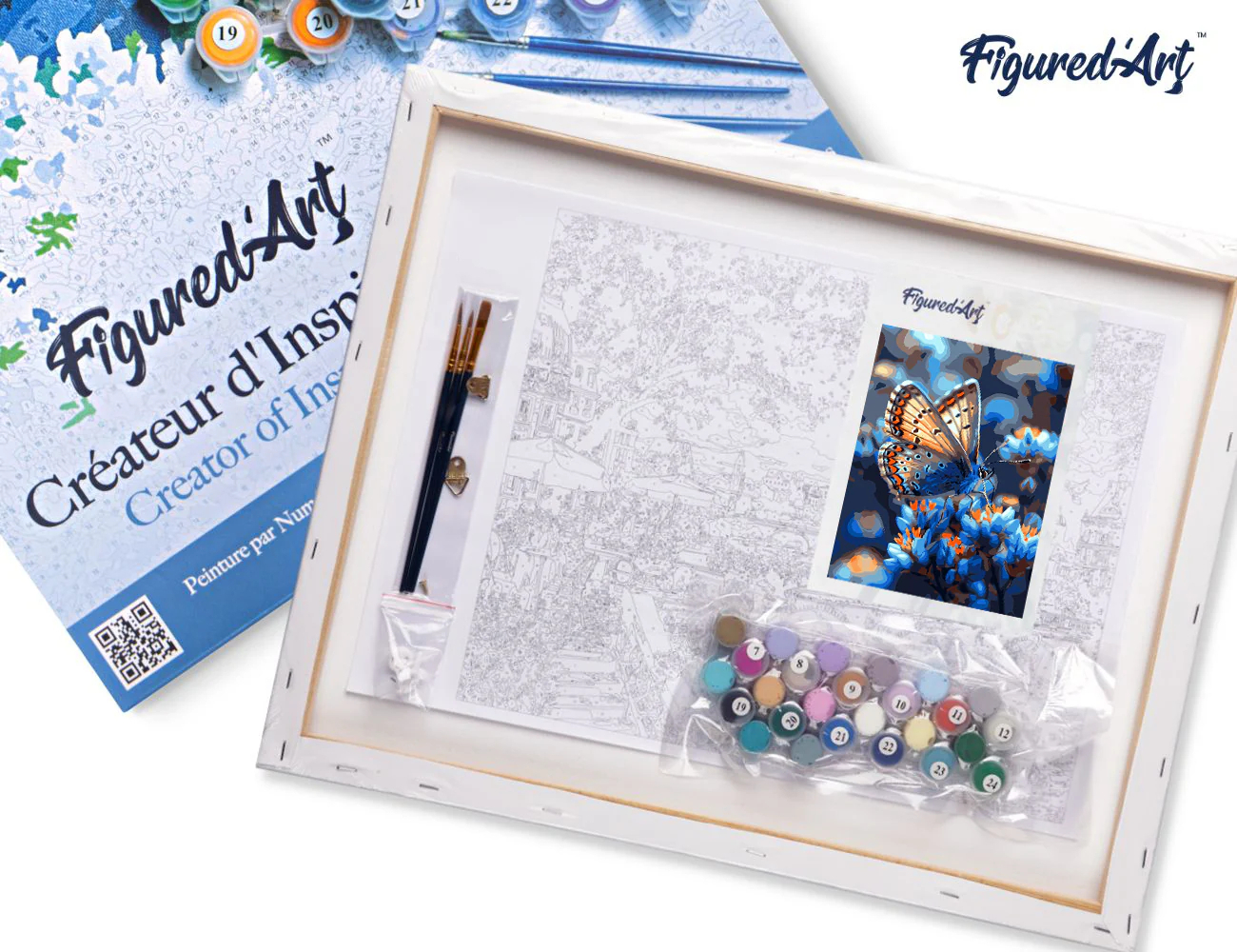Figure d'Art Set pictura pe numere, cu sasiu, Fluture si flori albastre, 40x50 cm
