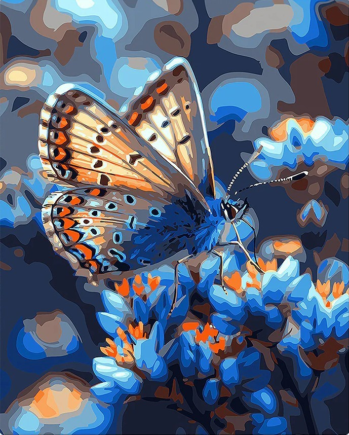 Set pictura pe numere cu sasiu inclus, Fluture si flori albastre, 40x50 cm. Pachetul contine: panza din in intinsa pe sasiu din lemn, setul de culori acrilice numerotate, pensule de diferite marimi si accesorii pentru a crea un tablou spectaculos. Da start creativitatii!