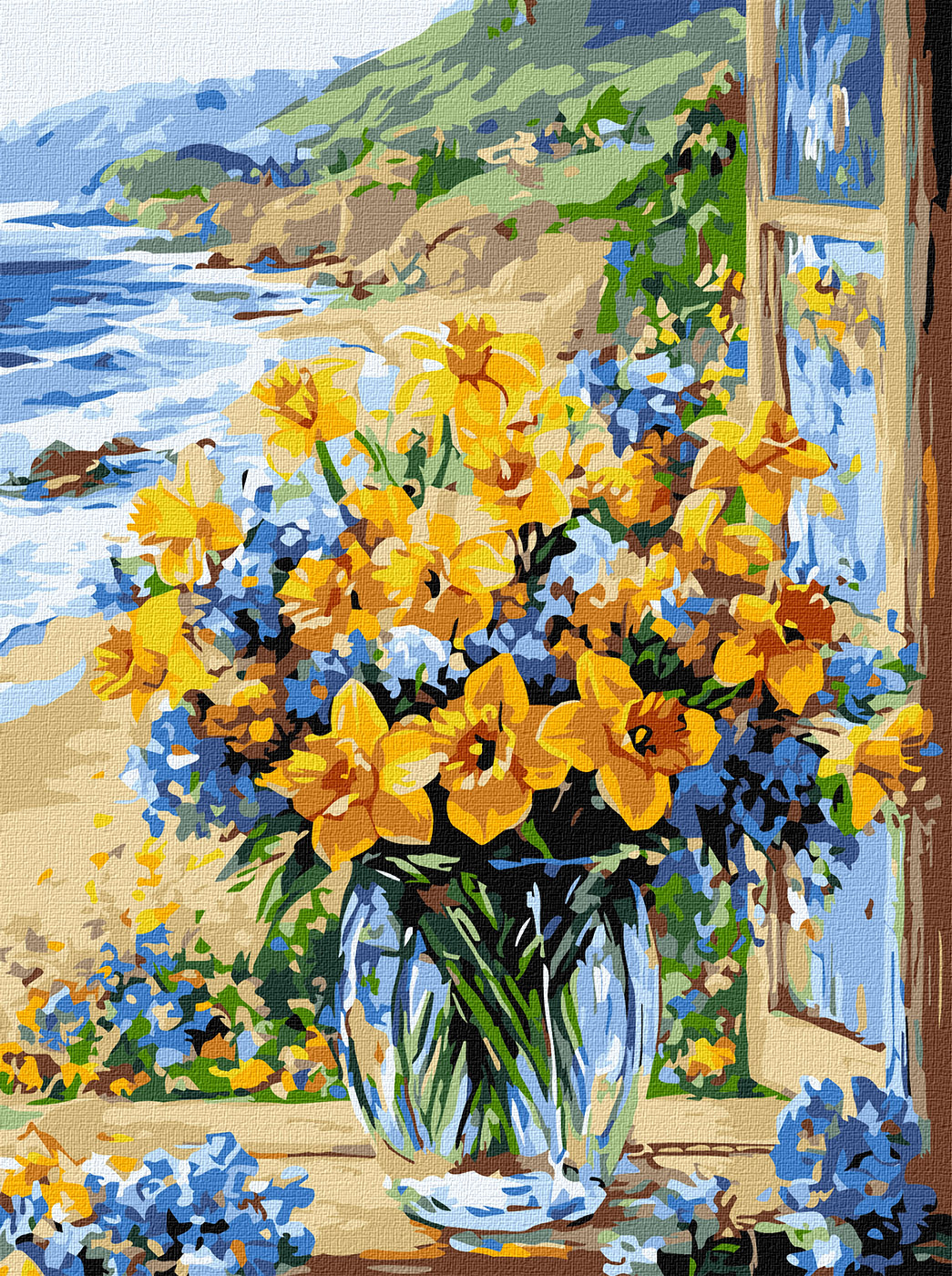 Set pictura pe numere cu sasiu inclus, Narcise si mare, 30x40 cm. Pachetul contine: panza din bumbac intinsa pe sasiu din lemn, setul de culori acrilice numerotate, pensule de diferite marimi si accesorii pentru a crea un tablou spectaculos. Da start creativitatii!