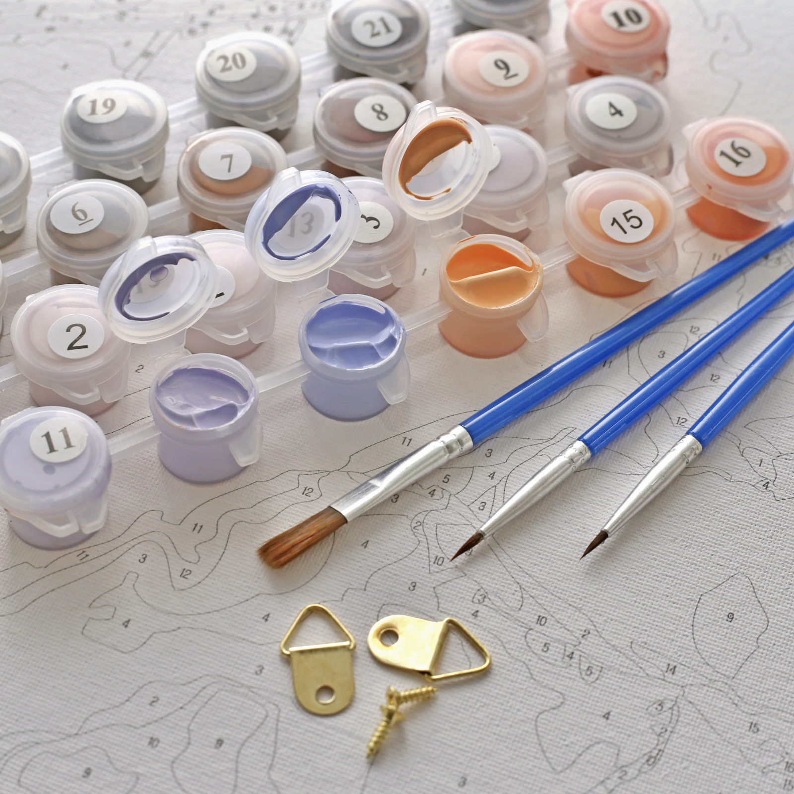 setul de culori acrilice numerotate, pensule de diferite marimi,