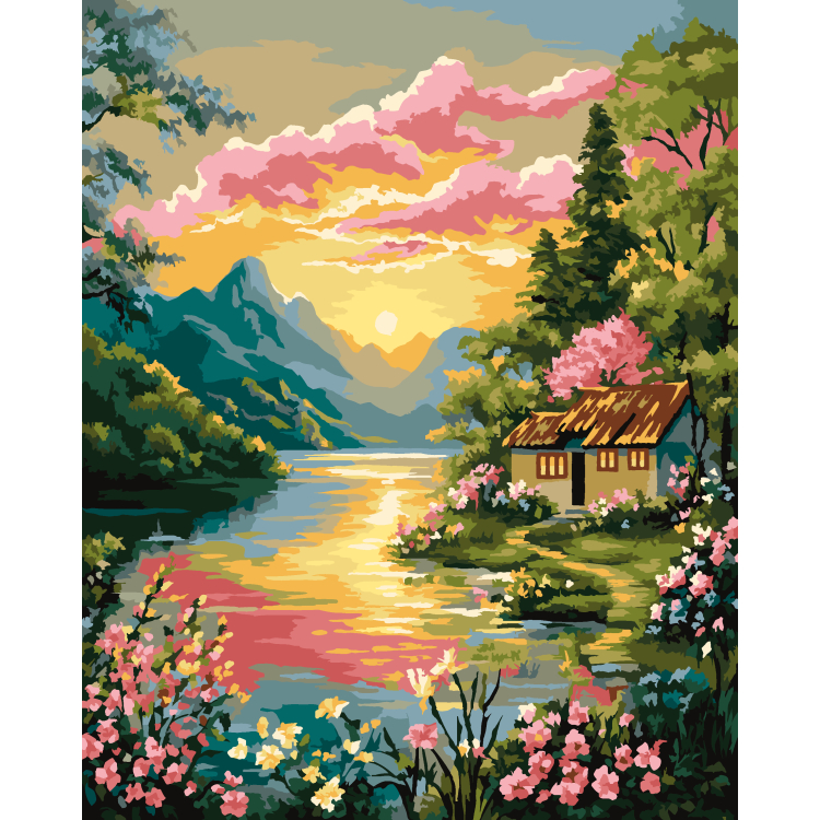 Set pictura pe numere  cu sasiu,  Peisaj la apus, 40x50 cm. Pachetul contine panza canvas cu imaginea finala deja imprimata, recipiente cu vopsea acrilica, 3 pensule de diferite grosimi,  agatatoare pentru perete, instructiuni. Da start creativitatii