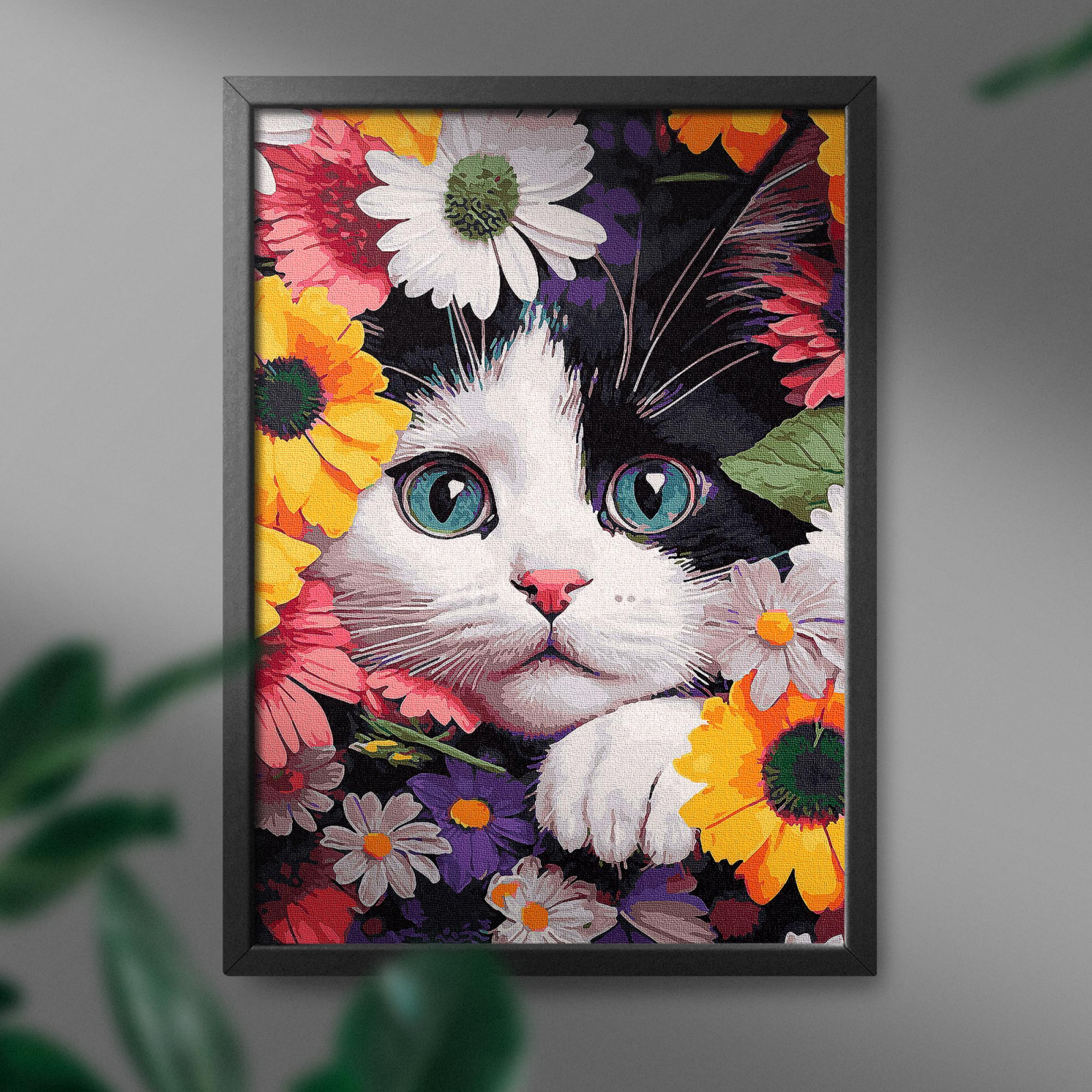 Set pictura pe numere, cu sasiu, Pisica si flori, 40x50 cm
