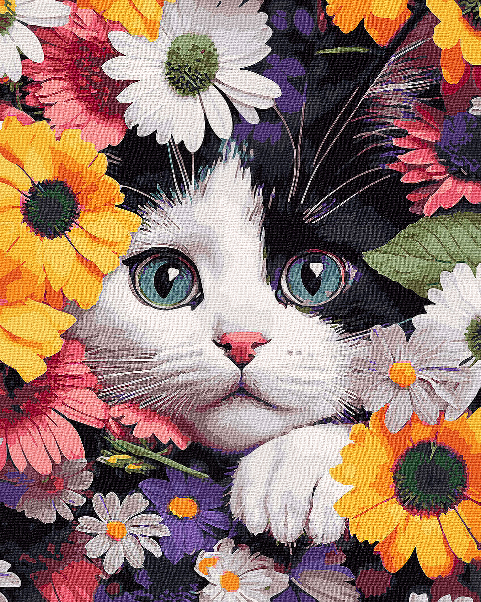 Set pictura pe numere cu sasiu, Pisica si flori, 40x50cm. Pachetul contine: panza din bumbac intinsa pe sasiu din lemn, set de culori acrilice clasice, pensule de diferite marimi si accesorii pentru a crea un tablou spectaculos. Da start creativitatii!