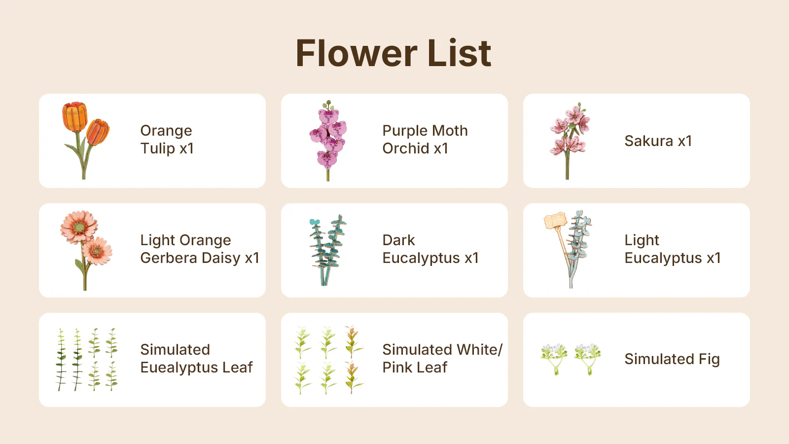 Cartea cu flori din lemn include laleaua portocalie, sakura, orhideea roz, gerbera portocalie, eucalipt si alte frunze decorative.