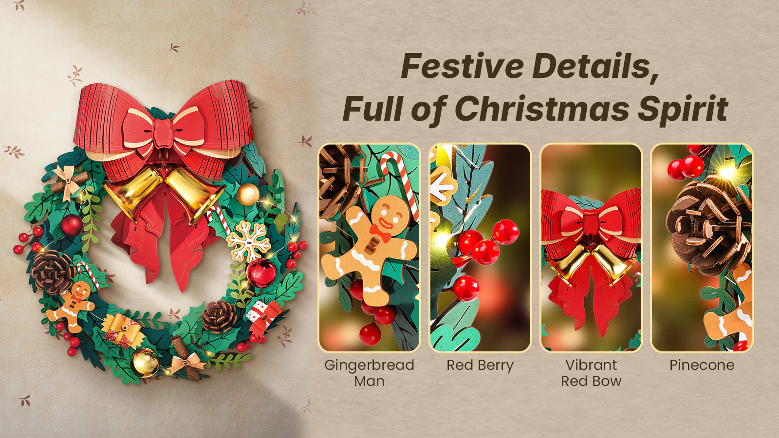 Coronita de Craciun este un simbol al bucuriei sezonului si al sperantei vesnice. Ornamente stralucitoare precum ilex, ghinde, fulgi de zapada, fructe de padure, omuleti de turta dulce, acadele si cadouri sunt cuibarite pe un cerc de conifere. O funda roșie gigantica cu clopotei aurii incununeaza totul, creand o demonstratie vesela a bucuriei Craciunului. Exista chiar si un aspect interactiv al acestei piese, deoarece clopoteii zornaie atunci cand ii scuturi. Cu 252 de piese interconectate precis, esti intampinat cu un puzzle de nivel de 3 stele care te va mentine concentrat cu bucurie timp de aproximativ patru ore. Ofera-ti un sezon de sarbatori vesel construind si expunand