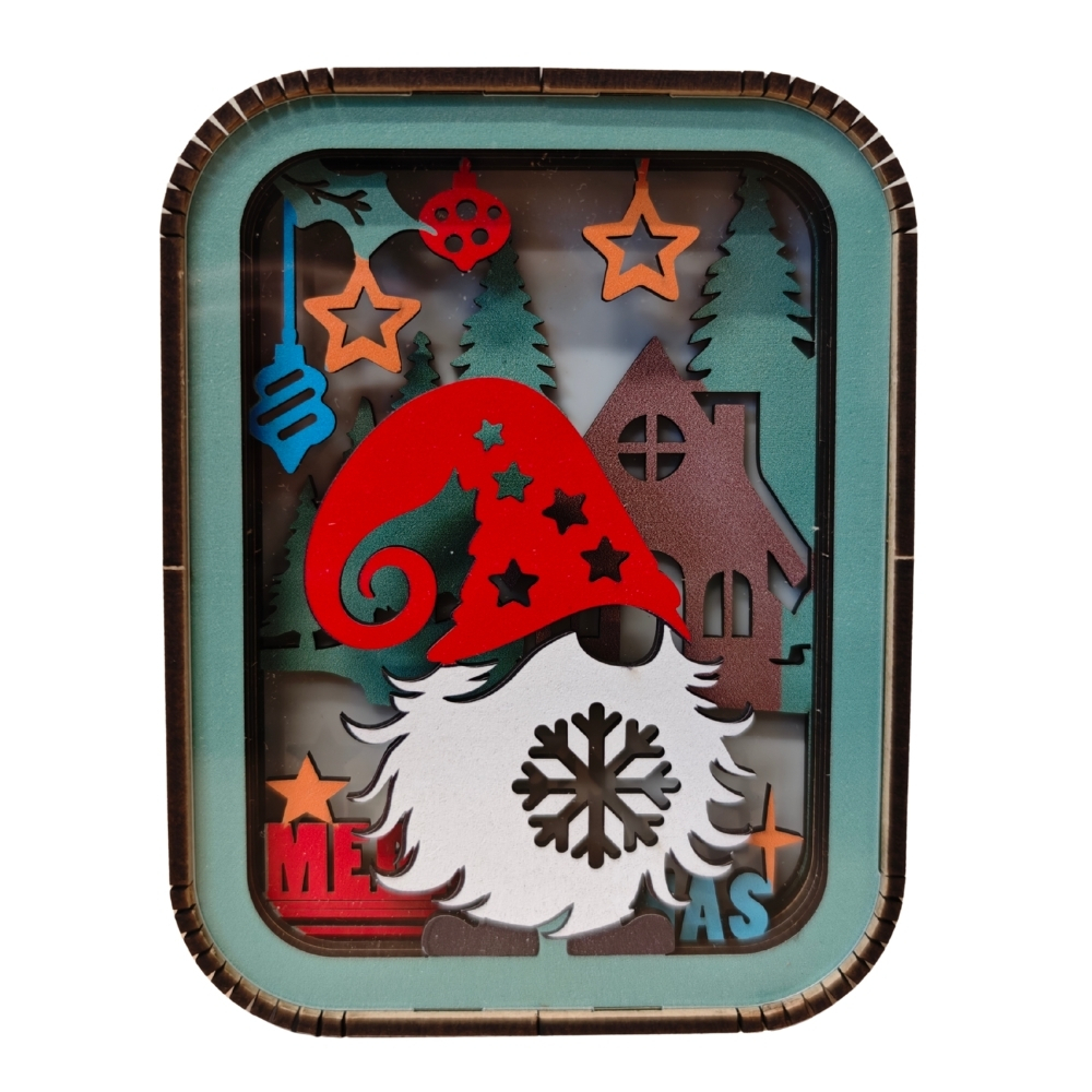 Adauga un strop de magie sarbatorilor cu lampa de veghe Pitic de Craciun, o piesa decorativa vesela si luminoasa care transforma orice camera intr-un colt de basm. Realizata din placi de lemn taiate cu laser, lampa reda o scena de iarna plina de culoare – un pitic cu caciula rosie, braduti, casuta si decoratiuni festive.
