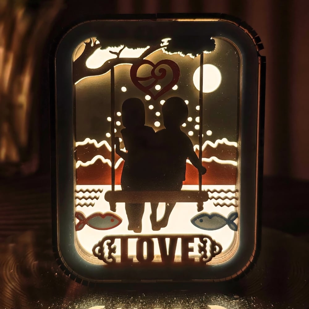 Creeaza o atmosfera plina de caldura si tandrete cu lampa de veghe  Poveste de dragoste – un puzzle care se tansforma rapid intr-un obiect de decor care aduce romantismul si emotia in orice camera. Realizata din straturi de lemn taiate cu precizie laser, aceasta lampa 3D reda un cuplu care se leagana sub un copac, scaldat in lumina blanda a apusului.