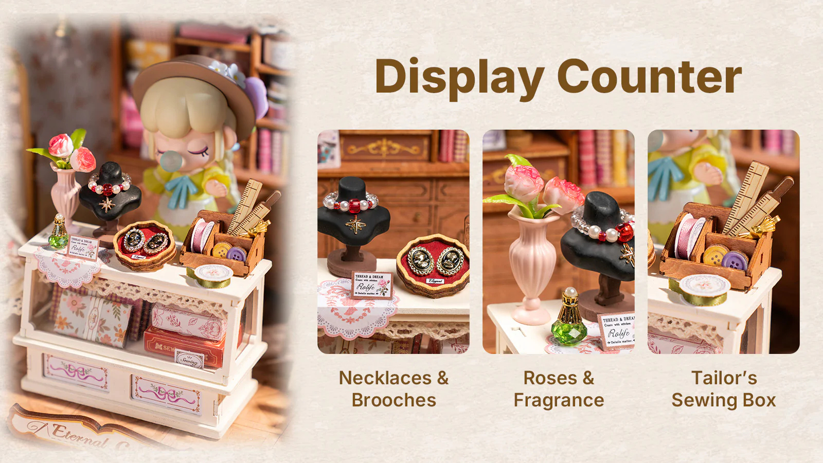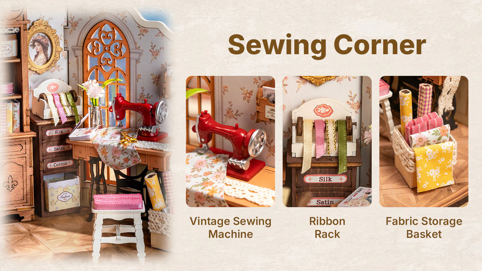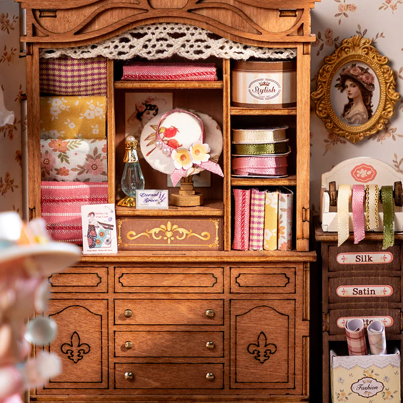 Nu-ti doresti sa ai propriul tau atelier ? Atelierul de croitorie al Elsei evoca atmosfera unui studio de croitorie vintage francez, cu atmosfera sa animata, plina de distractie, moda si eleganta. Incanta-ti ochii cu toate acele panglici de matase, dantela frantuzeasca si suluri de panza care se transforma in rochii elegante si delicate, facute la comanda, care ti se vor potrivi perfect. Adevarata ca un atelier de croitorie european din viata reala, aceasta casuta de papusi prezinta un manechin in picioare cu o rochie in lucru, cutii de palarii in culori pastelate, un kit de cusut clasic, o masina de cusut cu pedala, mostre de materiale textile si, bineinteles, foarfece de aur. Revino in epoca de aur a modei la comanda si incearca sa construiesti această frumoasa casuta in miniatura.