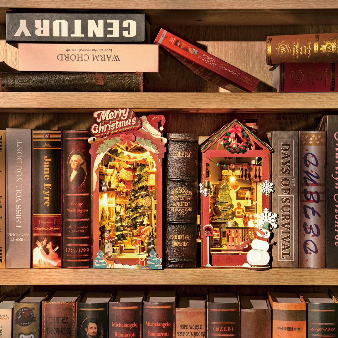 Pe o alee ingusta, decorata de Craciun, magazinele cu ferestre mici dau un aspect confortabil. Zapada se ingramadeste ici si colo pe strada, purtata de vântul proaspat. In spate, un brad impodobit stralucește in lumina serii. Intr-un colt, intre cadourile de Craciun, un om de zapada zambeste fericit. Magazinul cu „jucarii haioase” atrage privirile curioase ale copiilor si aduce la viata magia Craciunului. Fiecare colt si fiecare fatada a acestei alei fermecatoare sunt pline de spiritrul Craciunului. Vei crea tu insuti acest frumos kit din lemn, al unui  cotor de carte pe fatada caruia scrie „Craciun Fericit”!