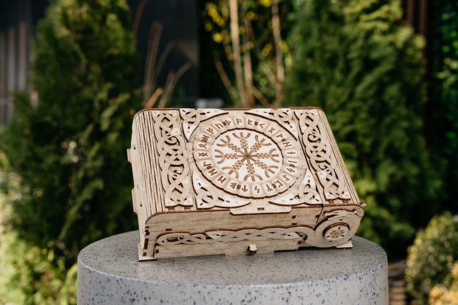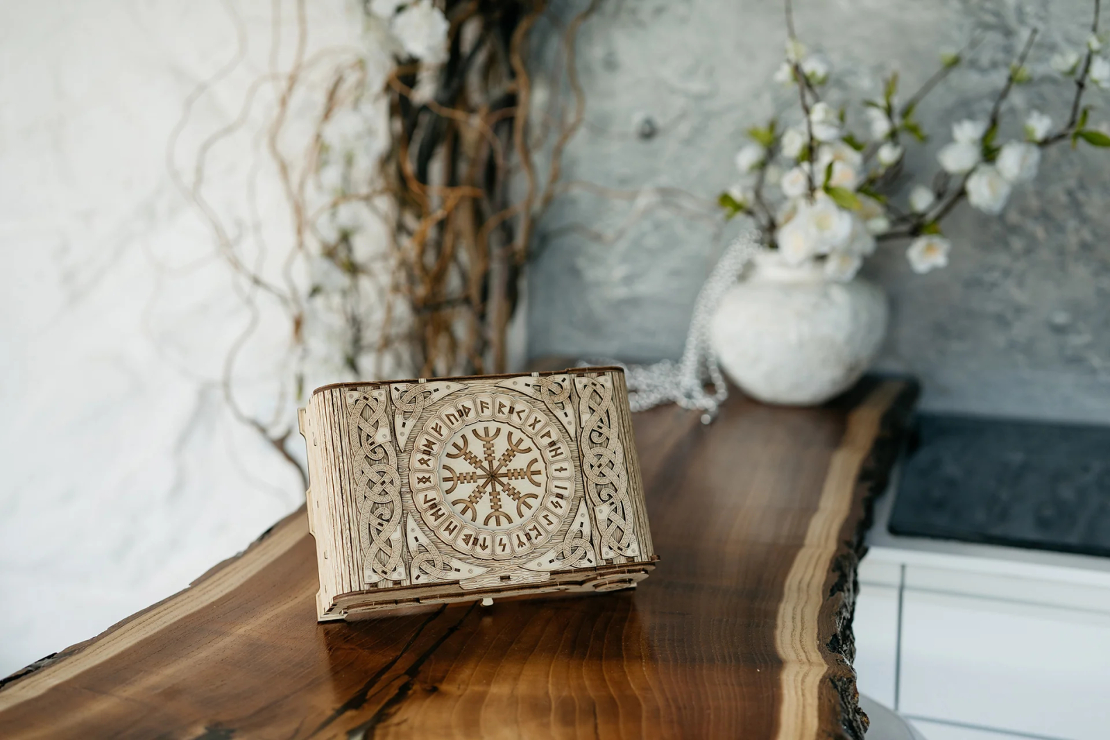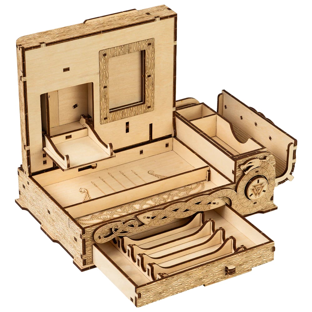Cufarul Nordic este un puzzle 3D din lemn conceput printr-un proces de asamblare captivant si mecanisme interne extrem de complexe. Acest puzzle 3D intruchipeaza esenta designului scandinav, combinand simplitatea, caracterul practic si lemnul natural. In interior, o gravura unica cu o nava vikinga, proiectata exclusiv de inginerul nostru, adauga o nota distinctiva. Creat cu grija, cu compartimente functionale si detalii complexe, Cufarul Nordic nu este doar o piesa de decor eleganta - este un organizator inteligent si versatil.
