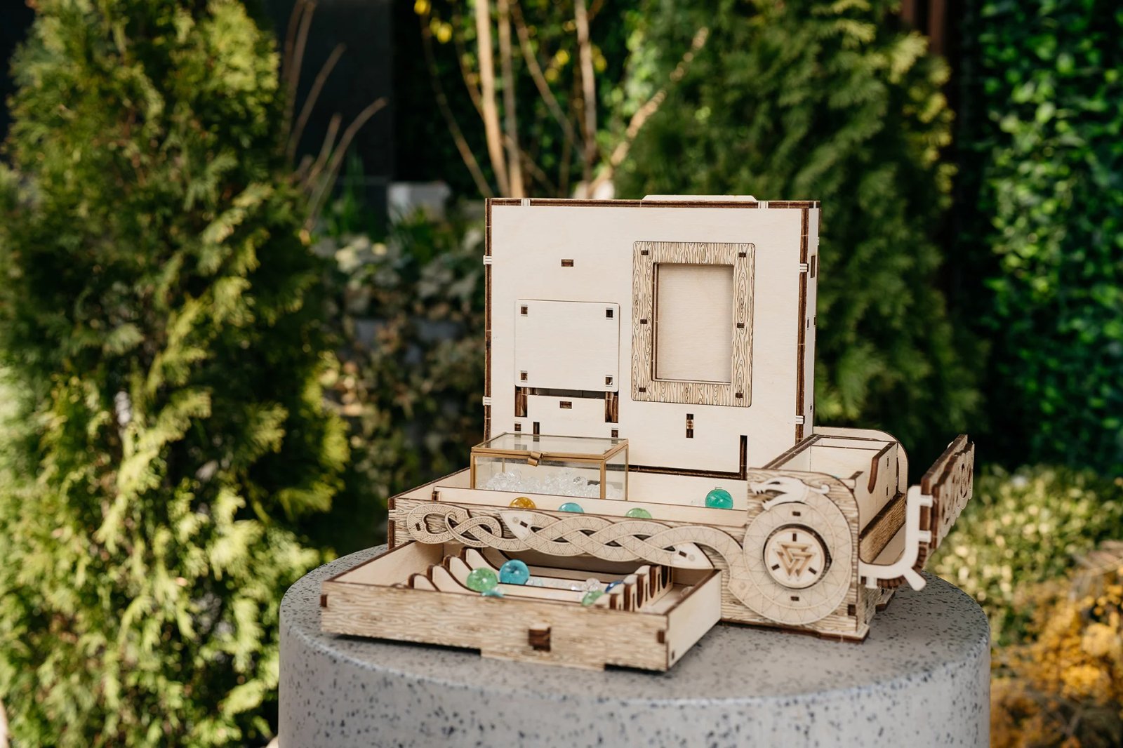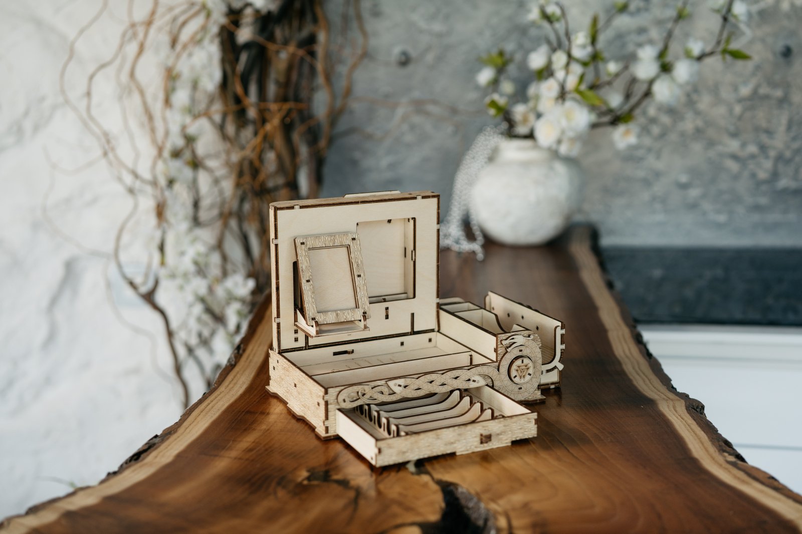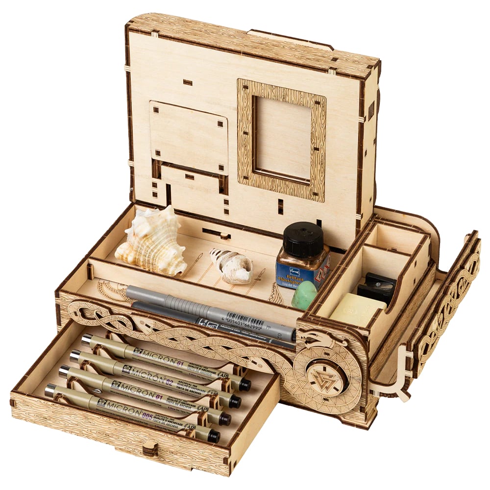Confectionata intr-un stil scandinav uimitor, aceasta cutie organizatoare din lemn ofera o provocare DIY captivanta, cu cele 202 de piese de asamblat si mecanisme interne inteligente. Compartimentul principal dispune de o rama foto si un suport pentru telefon, care se deschide cu un mecanism de parghie usor. Sectiunea laterala oferă depozitare convenabila pentru carti de vizitt, unitati USB si alte obiecte mici esentiale, in timp ce un sertar inferior va pastreaza pixurile si creioanele organizate cu grija. Dar adevarata intriga consta in compartimentul sau ascuns, care se deblocheaza doar atunci cand parghia este pozitionata corect.
