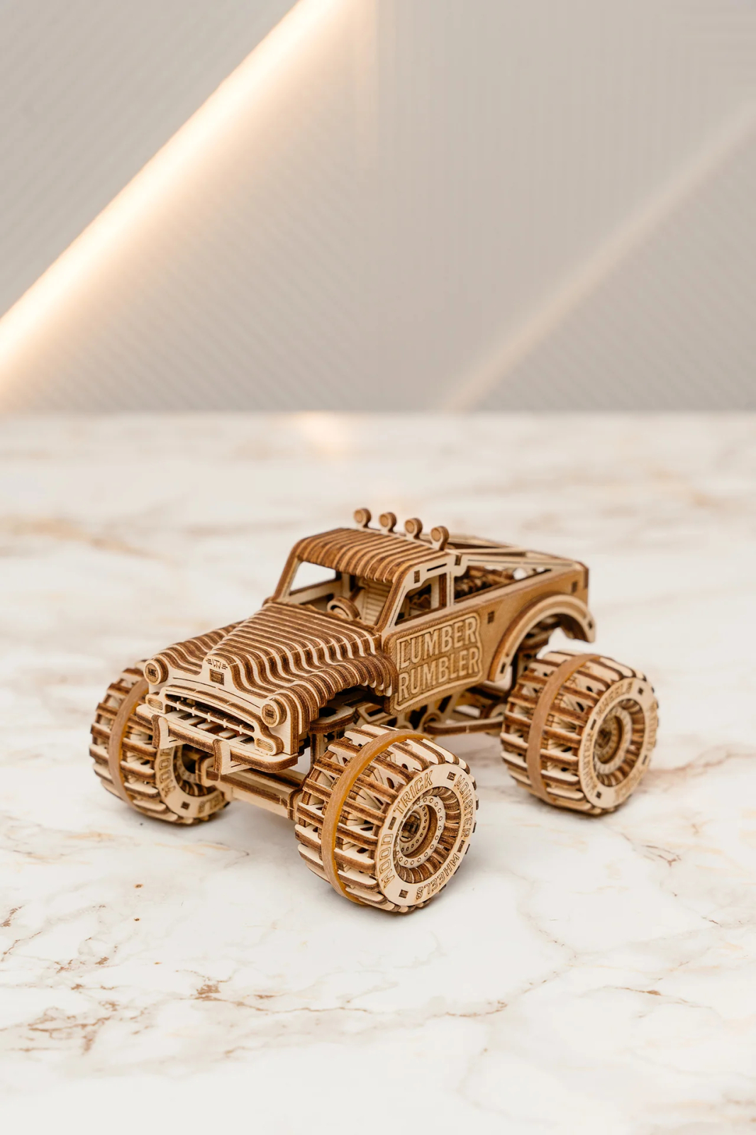 Inspirat de energia spectacolelor Monster Jam si de camioanele gigantice care domina arenele de curse, Lumber Rumbler aduce aceeasi adrenalina in lumea puzzle-urilor mecanice din lemn. Modelul are roti masive, un design robust si un stil care aminteste de masinile clasice americane, creand un vehicul miniatural plin de personalitate.