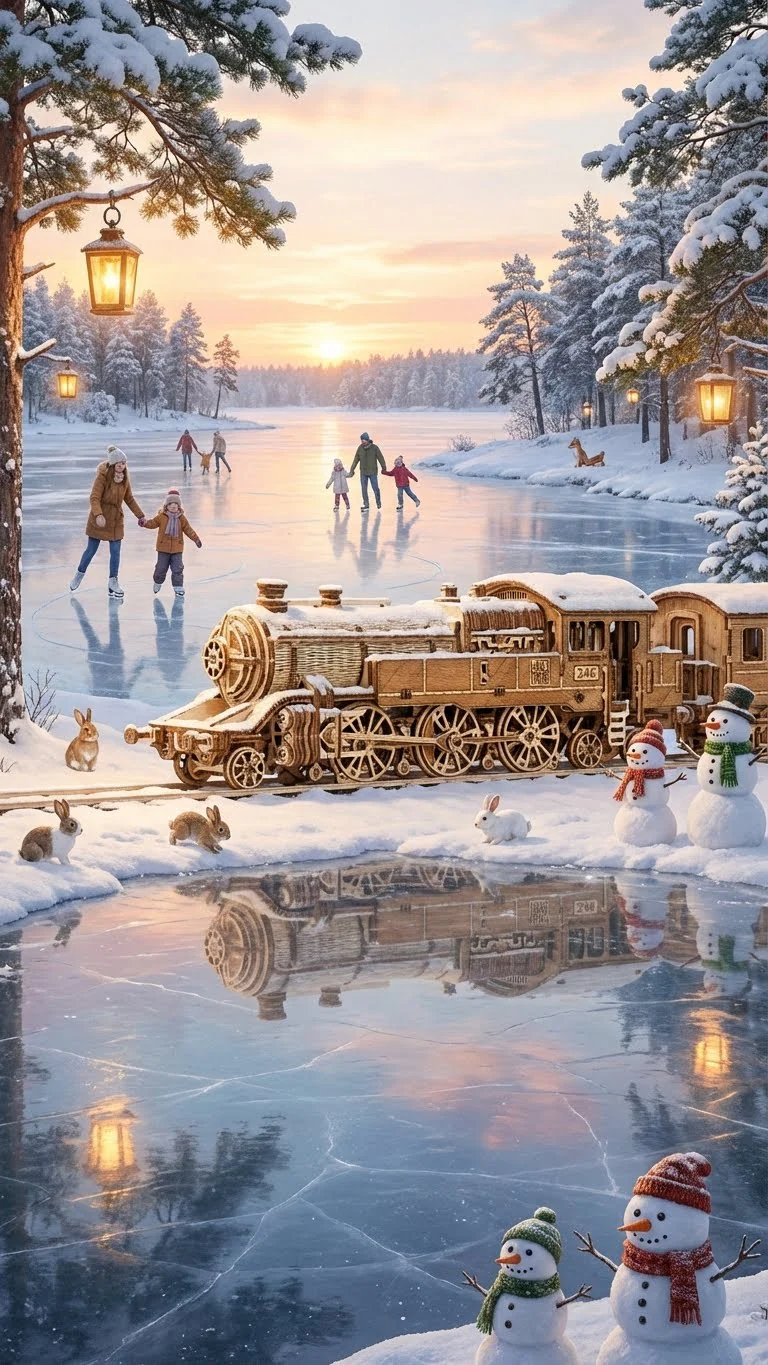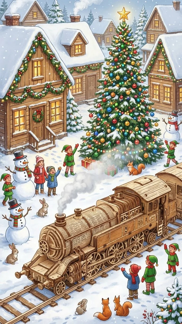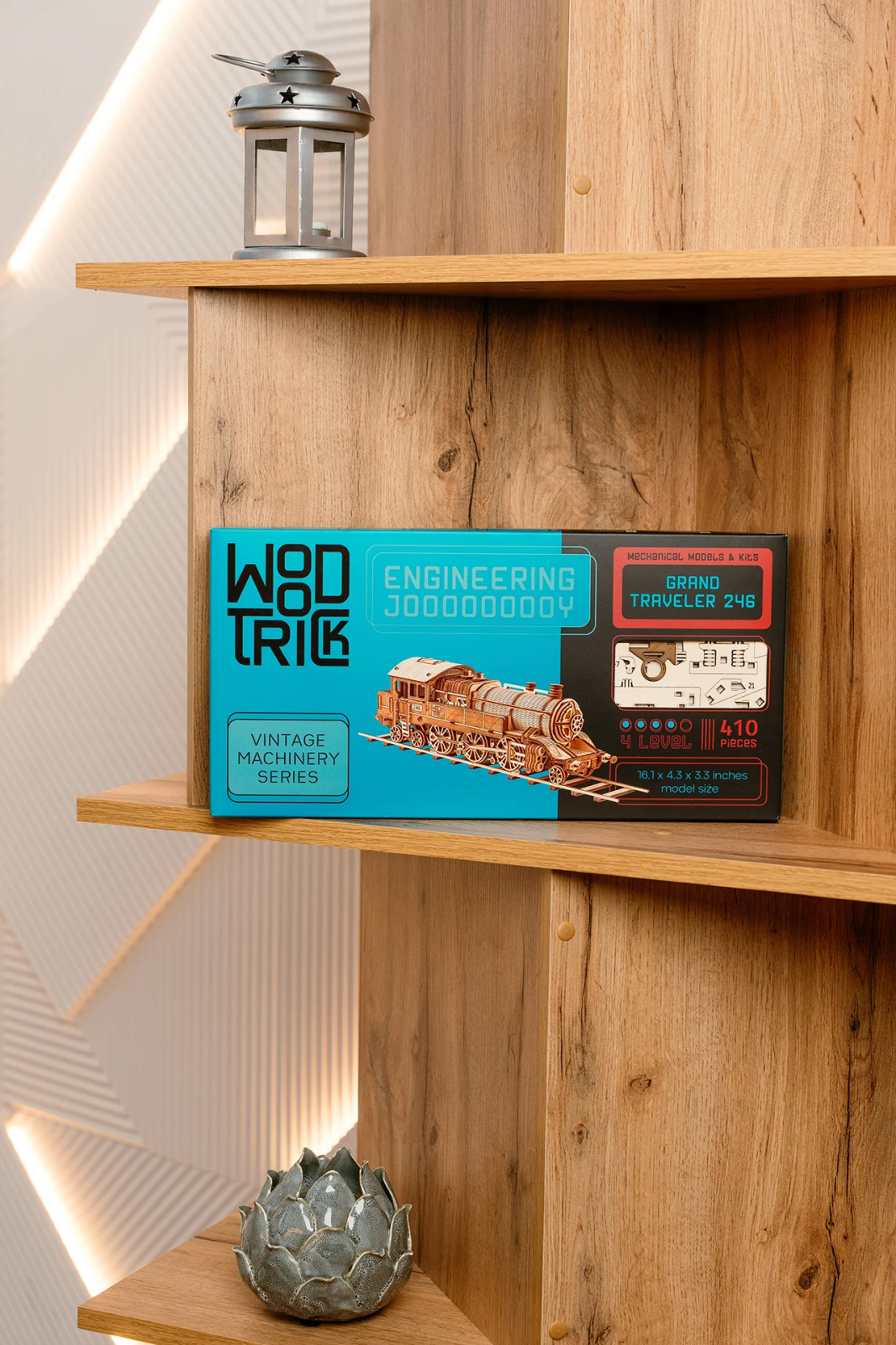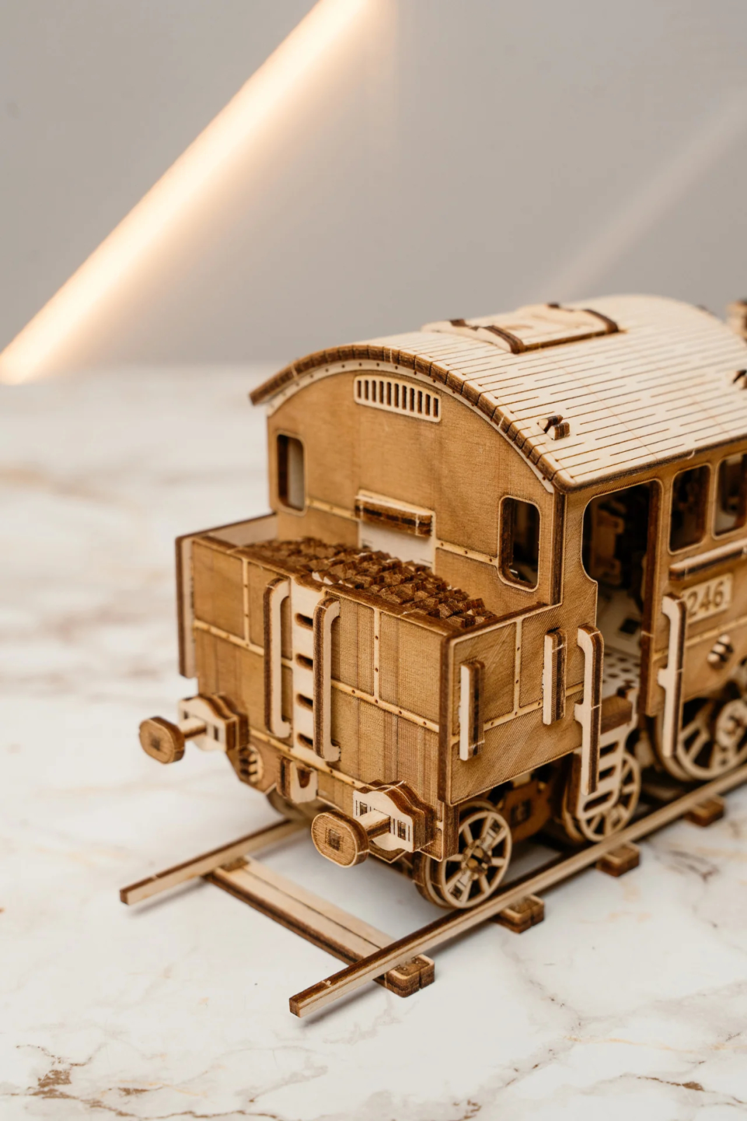 Inspirat de locomotivele istorice care au schimbat modul in care oamenii calatoreau si transportau marfa, Marele calator 246 reproduce in miniatura eleganta si complexitatea unei locomotive cu abur. Modelul impresioneaza prin numeroasele detalii mecanice: roti mari, biele articulate si structura complexa a cazanului, toate recreate cu precizie din lemn.