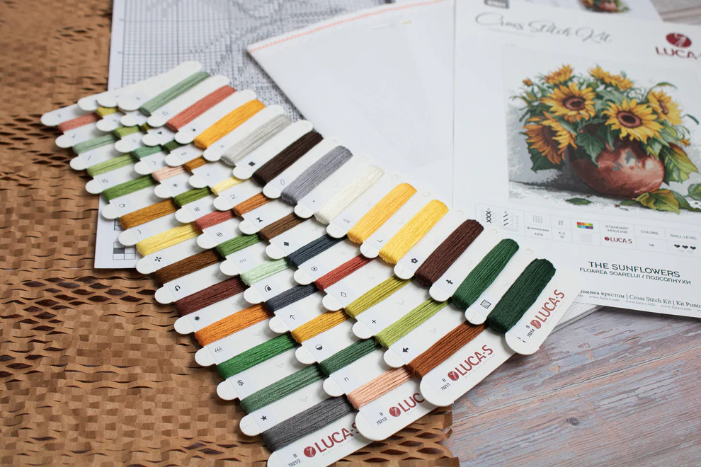 Set de brodat in cruciulita,  Floarea soarelui. Setul contine panza, 48 de seturi de ate colorate, ac, schema de realizare (diagrama) si instructiuni. Da start creativitatii!