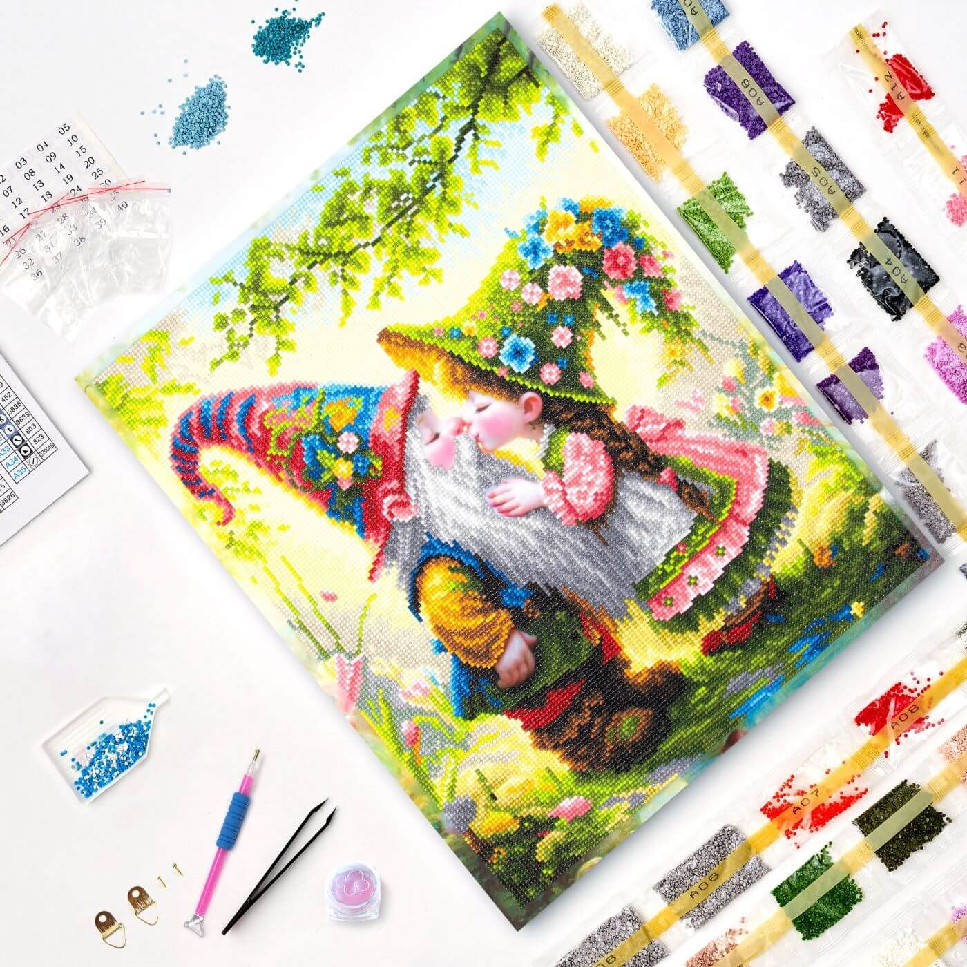 Set goblen cu diamante cu sasiu inclus, Poveste in doi. Pachetul contine: panza de lucru cu imagine tiparita si suprafata adeziva, margele tip diamante rotunde sortate dupa culori cu simboluri ce corespund cu locul lor pe imagine, o tavita pentru diamante, un recipient cu ceara speciala, un stilou special pentru prinderea si plasarea diamantelor si un ghid ilustrat de instructiuni. Da start creativitatii!