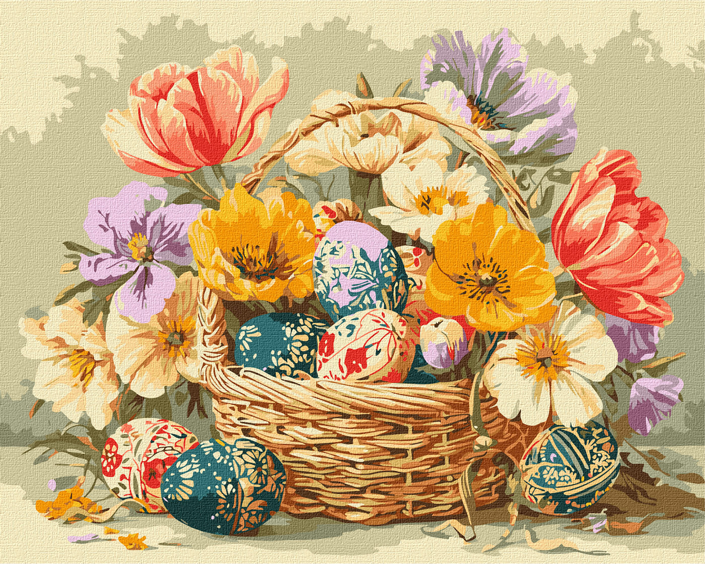 Set pictura pe numere, cu sasiu, Cos cu flori si oua, 40x50 cm