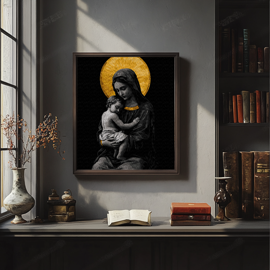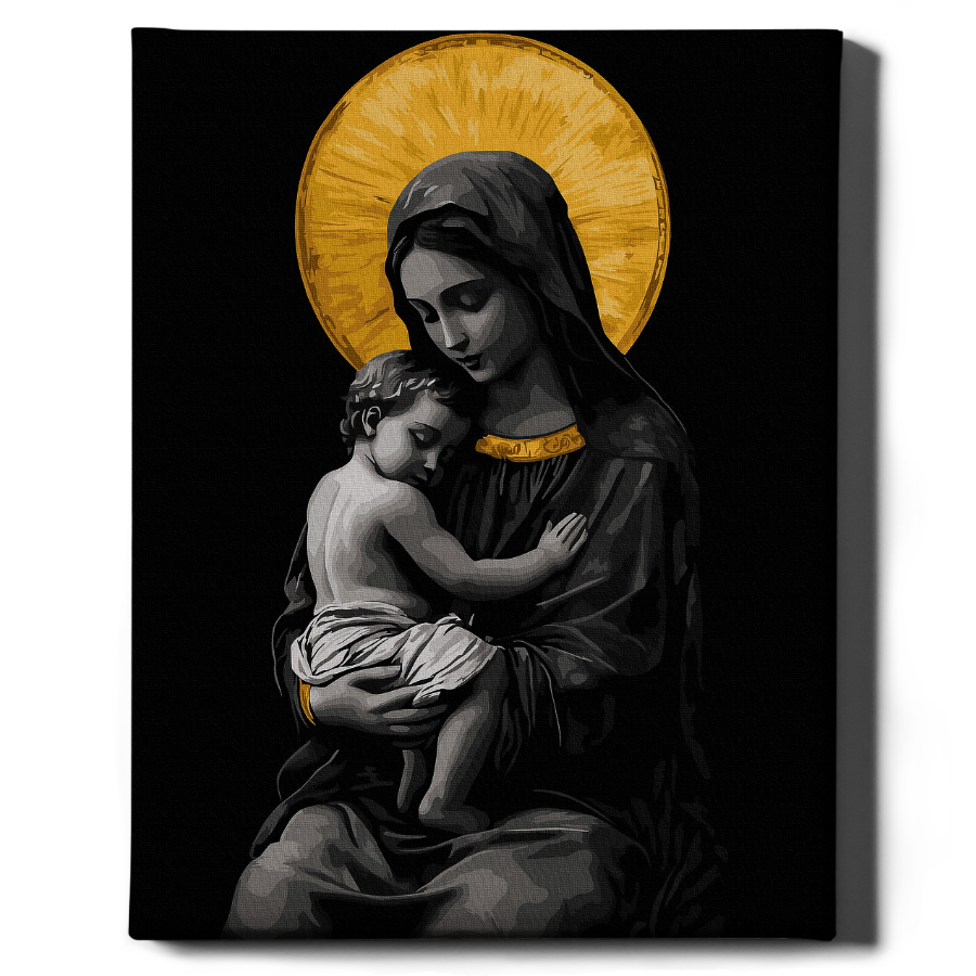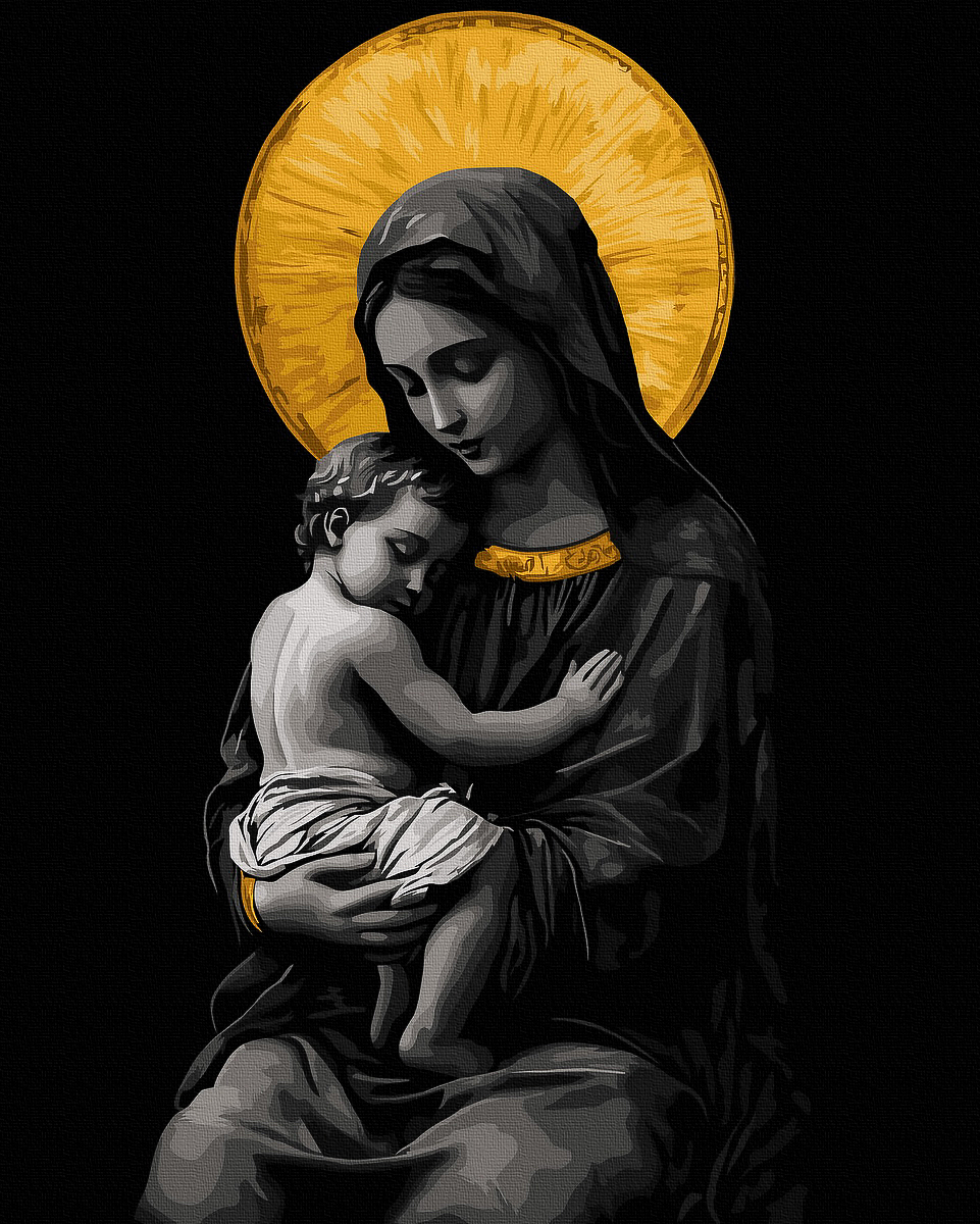 Set pictura pe numere cu sasiu, Maica de aur - culori aurii, 40x50 cm. Pachetul contine: panza din bumbac intinsa pe sasiu din lemn, set de culori acrilice clasice, pensule de diferite marimi si accesorii pentru a crea un tablou spectaculos. Da start creativitatii!