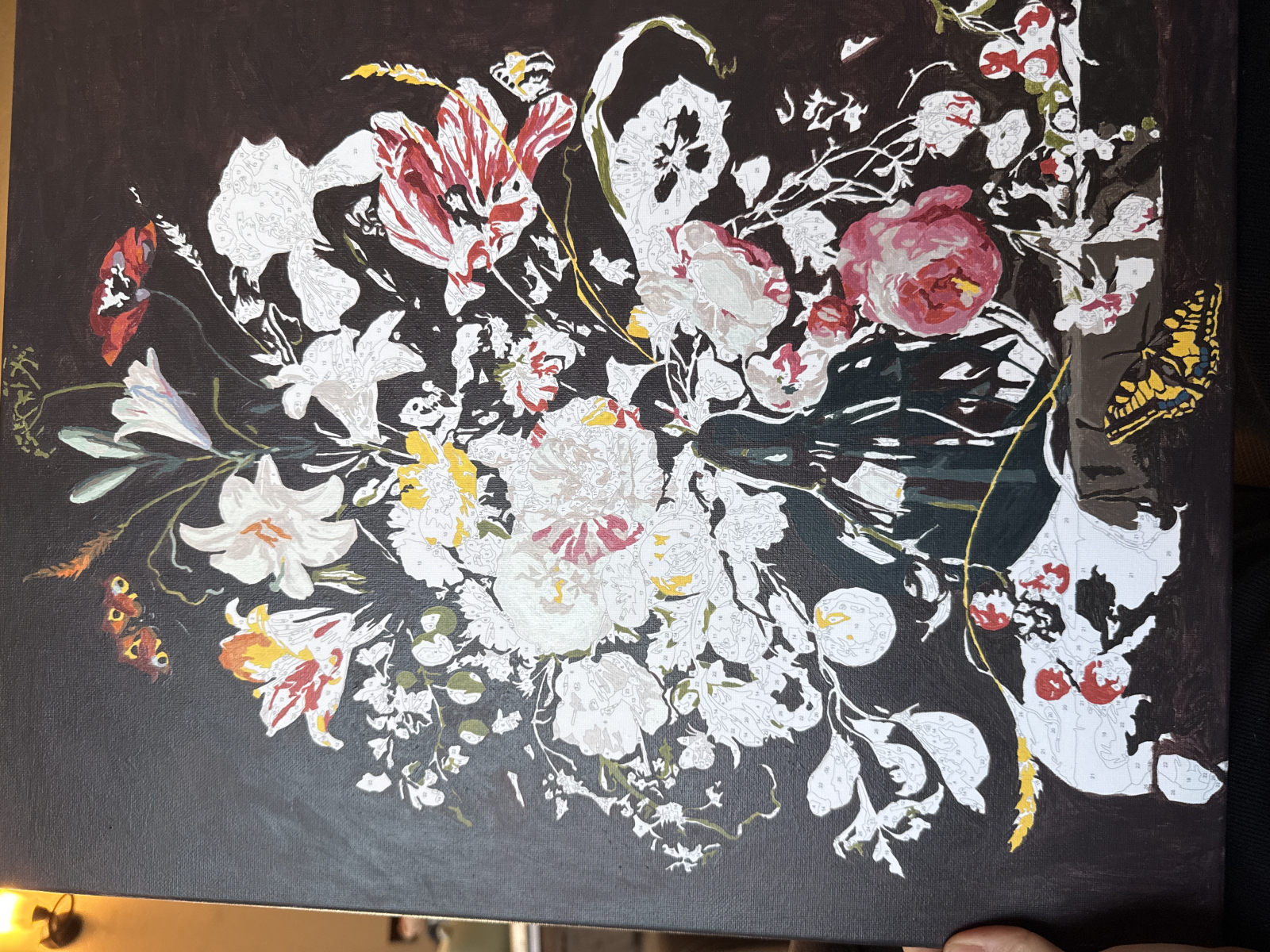 Set pictura pe numere cu sasiu inclus, Vaza cu flori si fructe. Pachetul contine: panza din bumbac intinsa pe sasiu din lemn, setul de culori acrilice numerotate, pensule de diferite marimi si accesorii pentru a crea un tablou spectaculos. Da start creativitatii!